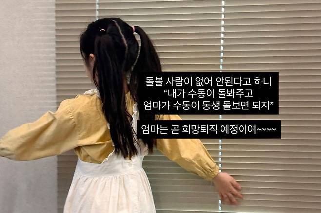 또한 김소영은 "돌볼 사람이 없어서 안 된다고 하니 '내가 수동이 돌봐주고 엄마가 수동이 동생 돌보면 되지'"라며 "엄마는 곧 희망퇴직 예정"이라고 덧붙여 유쾌한 가족 대화를 전했다.
