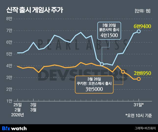 대형 신작을 앞세워 반등을 노렸던 펄어비스와 데브시스터즈의 희비가 엇갈리고 있다. 펄어비스의 '붉은사막'은 출시 직전 예상보다 낮은 평가에 주가가 급락했지만 이내 기대 이상의 판매량으로 분위기 반전에 성공했다. 반면 데브시스터즈의 '쿠키런: 오븐스매시'는 신작 출시효과가 무색해질 정도로 주가가 내리막을 탔다.