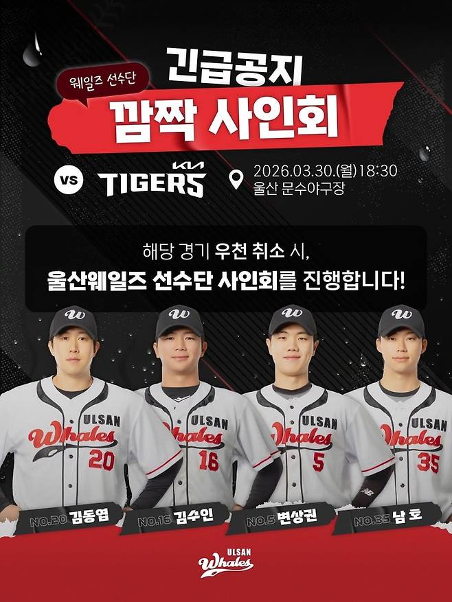울산 웨일즈는 지난 30일 18시 30분 문수야구장에서 열릴 예정이던 KIA 타이거즈와의 '먼데이 나이트 베이스볼' 경기가 우천으로 취소되자, 팬들을 위한 특별한 시간을 마련했다.
