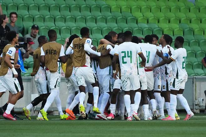[멜버른=AP/뉴시스] 카메룬 선수들이 31일(현지 시간) 호주 멜버른 렉탱귤러 스타디움에서 열린 중국과 평가전 전반 3분 칼 에용의 선제골에 환호하고 있다. 카메룬이 후반 35분 현재 2-0으로 앞서가고 있다. 2026.03.31.