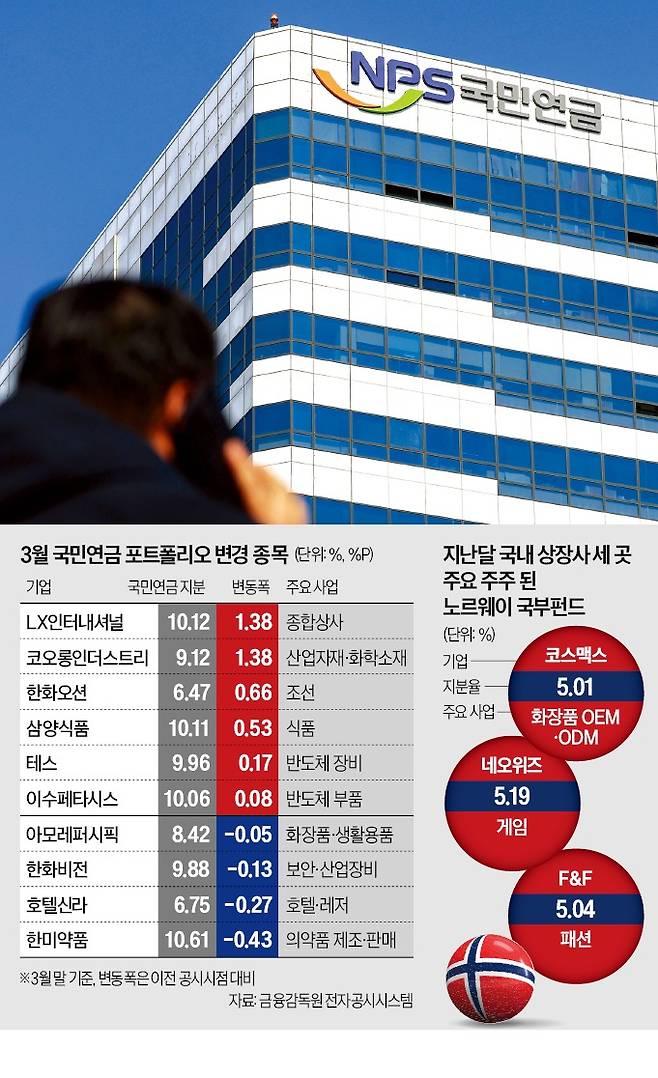미국·이스라엘과 이란 간 전쟁 발발 후 3월 한 달간 국내외 대표 연기금은 어떤 국내 주식을 사고팔았을까. 국민연금은 원자재·화학소재기업과 반도체 소부장(소재·부품·장비) 기업 지분을 늘린 것으로 나타났다. 세계 최대 국부펀드를 운용하는 노르웨이 중앙은행은 코스맥스, 네오위즈 등의 지분을 사들였다.