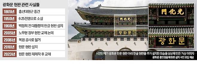 광화문 현판은 정권이 바뀔 때마다 논란의 중심이었다. 6·25 전쟁으로 불탄 광화문을 박정희 대통령이 1968년 철근콘크리트로, 재건하고 여기에 친필 한글 현판을 단 게 시작이었다. 박 대통령의 친필이 서울의 중심에 있는 왕궁 정문에 걸려 있다는 사실에 반발하는 사람들이 생겨났기 때문이다. 2005년 노무현 정부가 현판을 교체하려다가 정쟁 끝에 흐지부지된 일도 있었다.