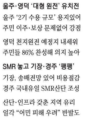 SMR 유치에 나선 기장군과 경주시는 유치 필요성 등을 알리는 주민설명회에 집중하고 있다. 기장군은 고리본부 내 22만㎡의 유휴용지가 있고, 이미 송배전망 등도 다 깔려 있어 건설비 등을 절감할 수 있다는 점을 강점으로 내세우고 있다. 국내 유일의 SMR 국가산업단지가 조성 중인 경주시는 "SMR 국가산단 조성 덕분에 산단 내 기업의 유치 의향서도 많이 들어오는 상황"이라고 말했다.