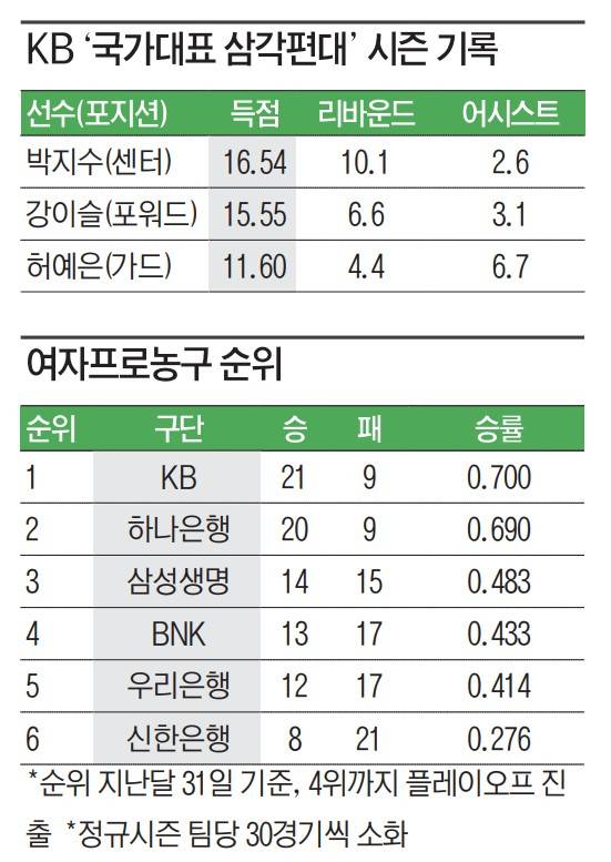 청주 KB가 '국가대표 삼각편대'의 활약을 앞세워 정규리그 우승 트로피를 들어 올렸다.
