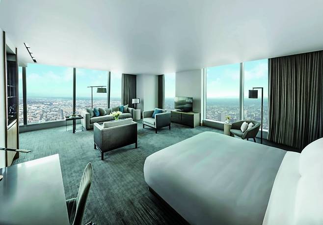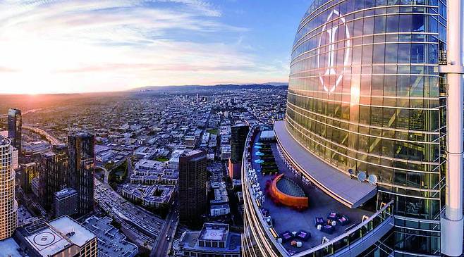 객실은 넉넉한 크기를 자랑하는데, 모든 객실이 바닥부터 천장까지 이어지는 통유리창을 갖춰 도시 전경을 감상할 수 있다. 객실이 곧 전망대가 되는 셈이다. 밤에는 발아래로 LA의 불빛이 반짝이는 별처럼 흩뿌려진다. 풍경이 낭만적인 덕분에, 호텔의 스테이크 레스토랑은 ‘프러포즈 명소’로 꼽힌다고. 73층 루프톱 바에서는 LA의 노을을 바라보면서 칵테일을 즐길 수 있다. 공항에서도 27km로 이동이 편리하고, 코리아타운을 비롯해 웬만한 관광지에 접근성이 뛰어나다.
