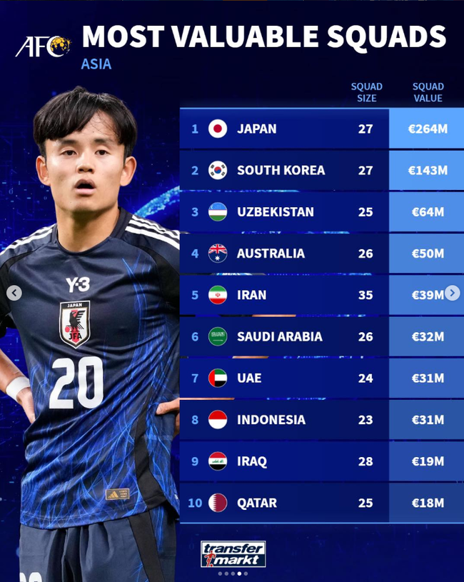 선수 개인을 보면 우즈베키스탄의 수비수 코디르 후사노프(맨체스터 시티)가 3500만 유로(약 610억 원)로 1위를 차지했다. 이 뒤를 일본의 구보 다케후사, 이강인, 사노 가이슈, 미토마 카오루, 김민재 등이 이었다.