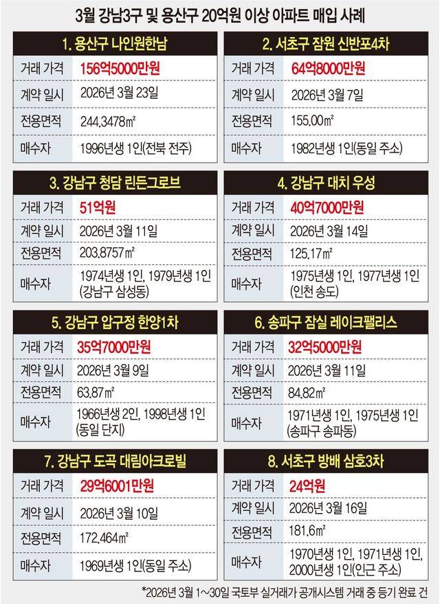 3월 1일부터 30일까지 국토교통부 실거래가 공개시스템에 등록된 강남 3구와 용산구 아파트 매매 거래 239건 중 31일 현재 등기가 완료돼 매수자 정보를 파악할 수 있는 매매가 20억원 이상 거래는 8건이었다. 이 가운데 외지인의 ‘최상급지 쇼핑’을 보여주는 거래는 용산구 나인원한남과 강남구 대치동 우성아파트에서 확인됐다.
