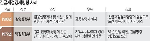 대통령이 국민 개개인의 권리를 제약할 수 있는 권한이기에 과거 행사 사례도 극히 적다. 1993년 김영삼 전 대통령이 ‘금융실명거래 및 비밀 보장에 관한 긴급재정경제명령’을 통해 금융실명화를 추진한 게 유일한 사례다. 박정희 전 대통령은 1972년 ‘경제 안정과 성장에 관한 긴급명령’을 발동해 기업의 사채 이자를 경감하고 부채 상환일을 연기했다. 당시엔 긴급재정경제명령과 긴급명령의 구분이 명확하지 않아 긴급명령의 명칭으로 권한이 행사됐다. 코로나19 당시 문재인정부도 검토했으나 정치적 리스크를 고려해 실제 활용하진 못했다.