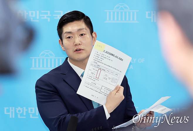 | ▲ 정원오 후보 해명 요구하는 김재섭 의원 김재섭 국민의힘 의원이 31일 서울 여의도 국회 소통관에서 기자회견을 열고 정원오 더불어민주당 서울시장 예비후보의 해명을 요구하고 있다. |
