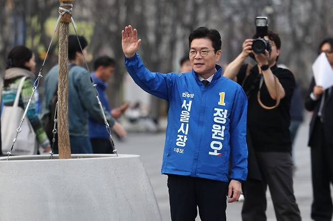 | ▲ 더불어민주당 서울시장 예비경선 투표 마지막 날인 3월 24일 서울 광화문광장에서 정원오 예비후보가 시민들을 향해 인사하고 있다. |