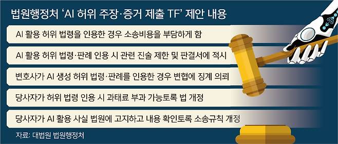 당사자가 허위 법령 등을 인용하는 경우 과태료를 부과할 수 있도록 하는 소송법 개정도 제안했다. 또 당사자 등이 AI 활용 사실을 소송 상대방과 법원에 알리고, 소송서류에 기재한 법령 등의 주요 내용이 정확한지 여부를 확인하도록 하는 내용의 민사소송규칙 개정도 함께 건의했다.