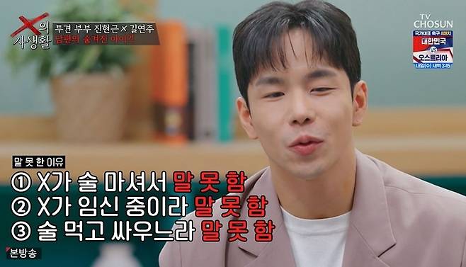 진현근은 숨긴 이유에 관해 "X가 술 마셔서, 임신 중이라, 술 먹고 싸우느라"라며 말도 안 되는 해명을 늘어놓았다. 김구라는 "매일 술 먹고 매일 싸우냐. 변명의 여지가 없는 것"이라며 "두려움에 말 안 한 거지, 얘기할 시간이 없다는 건 말이 안 되는 거다"라고 일갈했다.