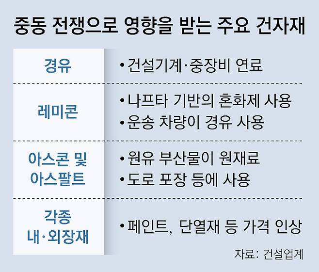 국토교통부는 건설 자재 수급 불확실성이 커지자 이날 ‘중동전쟁 기업애로 지원센터’를 통해 수급 안정화 지원에 나선다고 밝혔다. 국토부 관계자는 “산업통상부와 공조해 정부 차원의 필요한 대응을 할 것”이라고 했다.