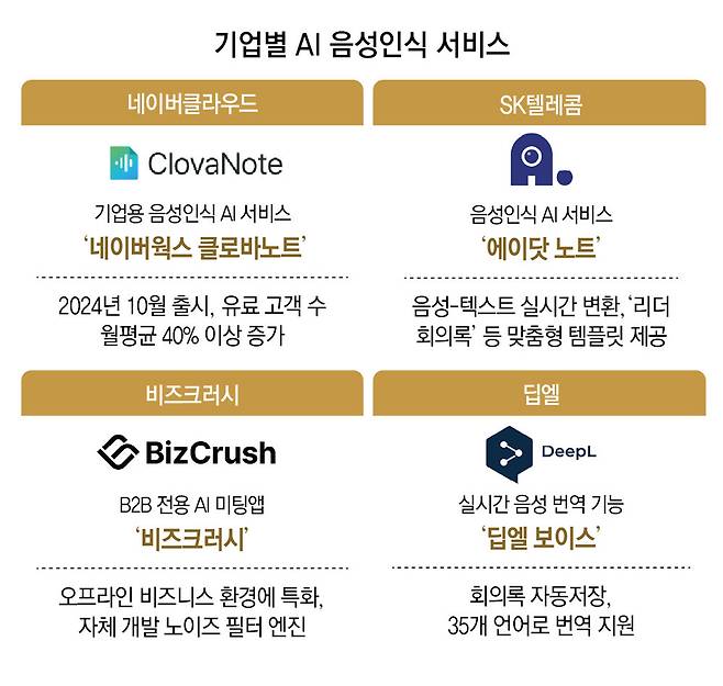 관련 스타트업도 틈새를 파고들고 있다. 기업 간 거래(B2B) 전용 AI 미팅앱 ‘비즈크러시’는 오프라인 비즈니스 환경에 특화됐다. 자체 개발한 노이즈 필터 엔진으로 카페나 콘퍼런스처럼 소음이 심한 환경에서도 높은 인식률을 구현한다. 글로벌 언어 AI 기업 ‘딥엘(DeepL)’은 회의록 자동 저장 등을 35개 언어로 지원하며 글로벌 협업을 돕는다.