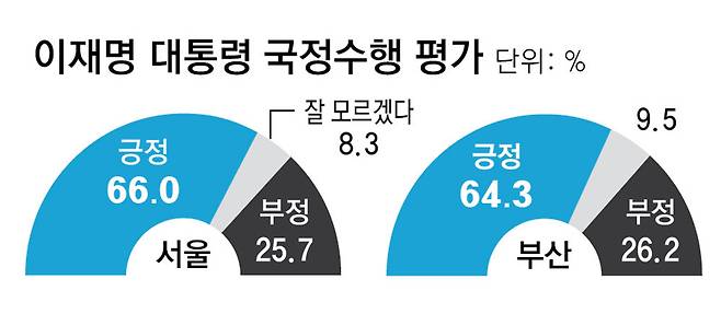 이재명 대통령의 국정 지지율이 서울과 부산에서 각각 66.0%, 64.3%로 모두 60%대 중반을 기록한 것으로 나타났다.
