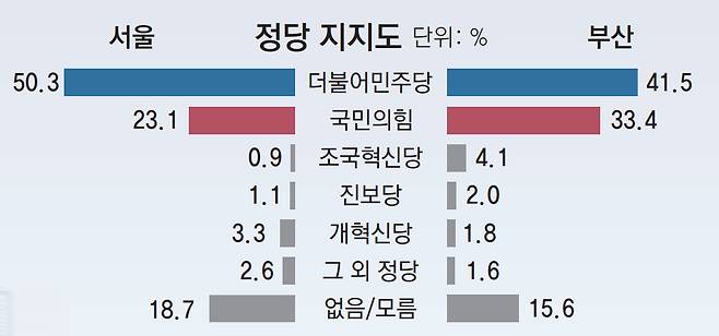 더불어민주당은 서울에서 과반의 지지율을 얻으며 국민의힘을 2배 이상 앞섰고, 부산에서도 오차범위 밖에서 국민의힘에 우세를 보였다.