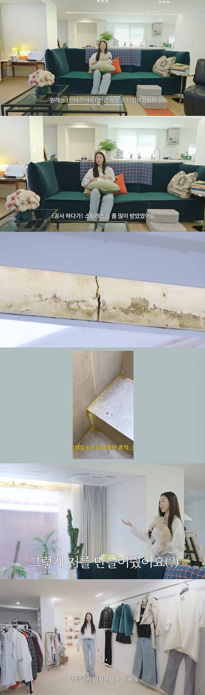 거실을 소개한 후 드레스룸으로 간 김사랑은 "다행히 여기는 비가 안 샌다. 대신에 저기 안에서 불을 켜면 여기 불이 켜진다. 엉망으로 하는 것"이라고 토로했다.