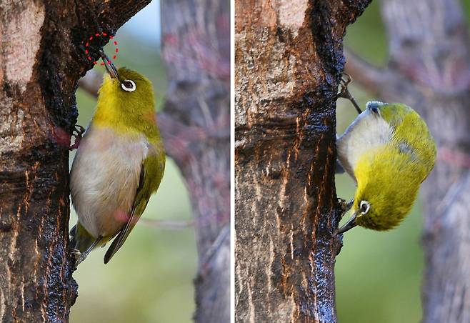 | ▲ 지난 설날 아침 단풍나무 수액을 먹는 동박새를 만났다. 아직 추운 2월인데 단풍나무엔 수액이 흘러 넘치고 있었다. |