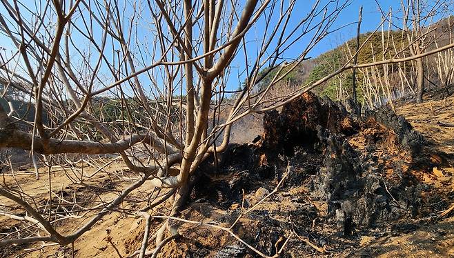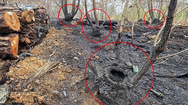 | ▲ 수관화로 잿더미가 된 의성산불 숲 바닥에 뿔 달린 활엽수 괴물 모습. 오랜 시간 잘리고, 싹이 나면 또 잘려 만들어진 괴물이다. |