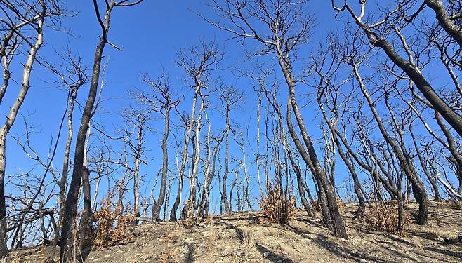 | ▲ 키 작은 활엽수들이 남겨진 곳에서 거센 산불이 멈추었다. 재선충 훈증더미의 뜨거운 불길조차 키 작은 활엽수를 넘어가지 못했다. 키 작은 활엽수들은 산불 확산을 막아주는 방화벽이다. |
