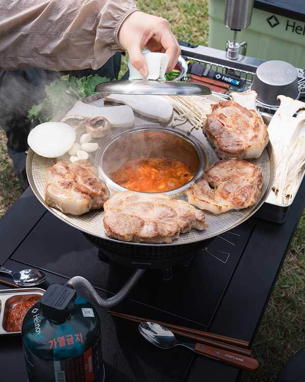 경량성과 휴대성을 갖춘 아웃도어 의자로 호평을 얻고 있는 글로벌 아웃도어 브랜드 헬리녹스Helinox가 한국 전통 식문화를 현대적으로 재해석한 캠핑 쿡웨어 '코리안 그릴 세트Korean Grill Set'를 출시했다. 헬리녹스 홈페이지에 실린 제품 개발 이야기에 따르면 한국은 옛날부터 아웃도어 활동을 즐긴 민족이며 좋은 사람들과 바깥에 모여서 불을 피우고, 고기를 굽고, 국물을 나누며 정을 쌓았다. 화합의 상징인 이 문화를 현대적인 장비로 재탄생시킨 것이 '코리안 그릴 세트'다.