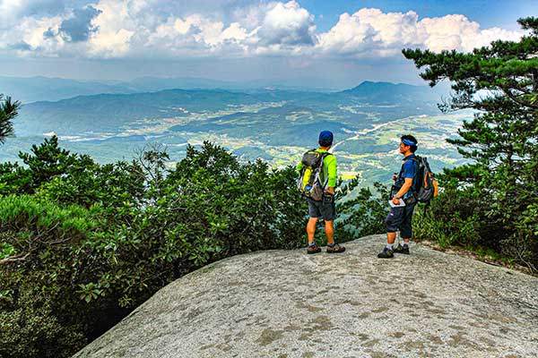 진악산은 인삼의 고장 금산과 떼려야 뗄 수 없는 금산의 진산이다. 부드러운 육산 같아 보이나 능선에 오르면 깎아지른 절벽과 암릉이 나타나는 반전 매력이 있다. 정상에 서면 금산 읍내가 한눈에 들어오고, 멀리 대둔산과 서대산, 덕유산 능선까지 파노라마처럼 펼쳐진다. 물굴과 관음굴은 인삼 전설의 배경이 된 동굴로 산속에 숨어 있어 신비로운 분위기를 자아낸다. 남동쪽 기슭에 있는 보석사寶石寺에는 높이 약 40m의 천연기념물 은행나무가 있는데, 나라에 큰일이 생길 때마다 소리 내어 울었다는 전설이 있다.