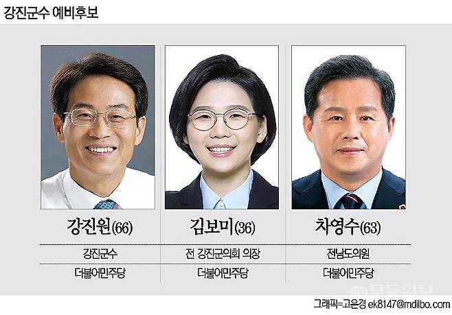 강진에선 무소속 후보가 세 차례(2002·2010·2022년) 당선된 적도 있다. 민주당 경선 후보들은 강 군수의 대세론에 맞서 당 지지층 결집과 정권 후광 효과를 기대할 것으로 보인다.