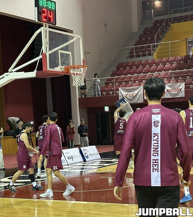 경력은 길지 않아도, 실력은 베테랑에 버금갔다. 힘찬 베스트 5 소개는 물론 매 상황을 적재적소에 설명하는 능력까지, 김다희 장내 아나운서는 쉼없이 마이크를 잡고, 선승관을 누볐다. 개막전 진행을 군더더기 없이 한 힘은, 경희대 선수단에도 100% 전달됐다.