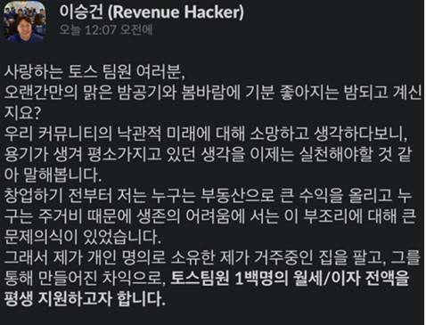 이 대표는 만우절인 1일 공지를 통해 "개인 명의로 소유한 거주 중인 집을 팔고, 그를 통해 만들어진 차익으로 토스 팀원 100명의 월세와 대출 이자 전액을 평생 지원하겠다"고 말했다.