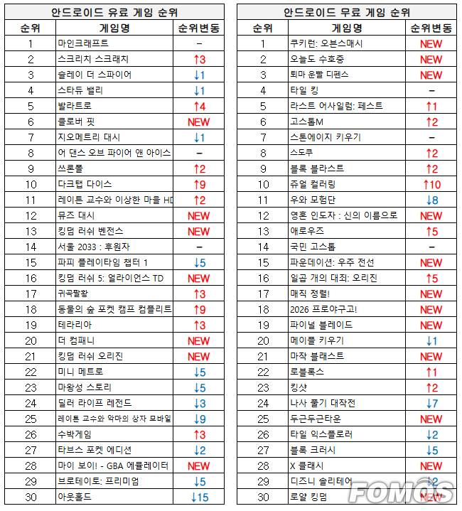안드로이드 무료 게임 순위에서는 데브시스터즈의 신작 '쿠키런: 오븐스매시'가 출시와 함께 1위를 차지했다.