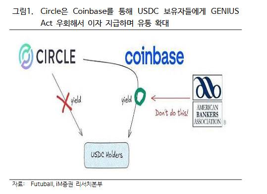 스테이블코인을 합법화한 기존 지니어스 액트(GENIUS Act)에서도 스테이블코인 발행사가 보유자에게 이자를 지급하는 행위는 금지했지만, 해당 규정이 엄격히 적용되지 않으면서 코인베이스와 같은 거래소는 서클의 USDC 보유자에게 이자를 지급하되, 서클이 코인베이스에 용을 지급하는 방식으로 사실상의 우회 지급이 이뤄져 왔다.