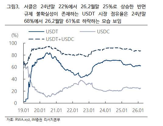 이에 양 애널리스트는 “현재 국면은 클래리티 액트에 따른 규제 압박과 테더의 신뢰 개선 시도가 동시에 반영되면서 서클에 단기적으로 다소 불리한 환경이 형성된 상황이지만, 테더의 지니어스 액트 수준의 규제 준수에는 일정 시간이 소요될 것으로 예상되고, 이에 따라 규제 정합성이 중요한 기관 수요, 결제 인프라, AI 기반 결제 시스템 영역에서는 USDC의 경쟁력이 상대적으로 유지되거나 일부 부각될 가능성이 있다”고 말했다.