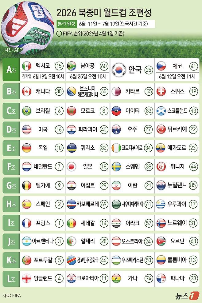(서울=뉴스1) 김초희 디자이너 = 홍명보호의 2026 국제축구연맹(FIFA) 북중미 월드컵 첫 상대가 체코로 결정됐다. 가장 우려했던 상대 덴마크는 피했지만 체코의 전력을 살펴보면 마냥 쉽지 않은 상대다. 2000년대 초반 체코는 FIFA 랭킹 2위까지 오를 정도로 유럽에서 주목하는 강팀이었다. 그러나 2010년 이후 뚜렷한 스타 플레이어가 등장하지 않으면서 월드컵과 인연을 맺지 못했다. 2006년 독일 대회 이후 20년 만에 월드컵 무대를 밟게 된 체코는 본선 A조에 속해 6월 12일 오전 11시(한국시간) 한국과 대회 첫 경기를 치른다.
