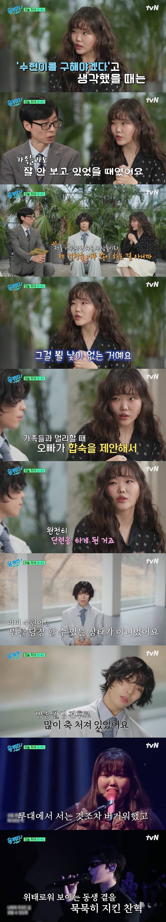 이날 이수현은 슬럼프 당시를 떠올리면서 오빠 이찬혁을 향항 고마움을 전했다. 그는 "오빠가 저의 심각성을 인지하고 '얘를 구해야겠다'라고 생각했을 때는 가족들과도 잘 안 볼 때였다"고 회상했다.