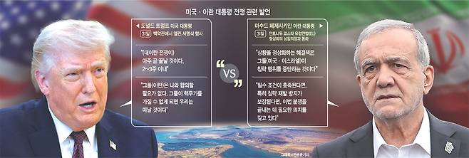 마수드 페제시키안 이란 대통령도 전쟁 종식 가능성을 공식적으로 언급했다. 그는 이날 안토니우 코스타 유럽연합(EU) 정상회의 상임의장과 통화에서 “상황 정상화를 위한 해결책은 그들(미국과 이스라엘)이 침략을 중단하는 것”이라며 “침략이 재발하지 않을 것이라는 보장이 있을 경우 이 전쟁을 종식시킬 의지가 있다”고 밝혔다. 페제시키안 대통령은 ‘필수 조건’으로 앞서 제시했던 5대 조건을 재차 거론했지만 최우선적인 조건으로 전쟁 재발 방지 보장을 꺼냈다. 이에 트럼프 대통령이 언급한 대로 2∼3주 내에 종전을 선언하고 미군을 철수시킬 경우 전쟁은 사실상 마무리될 것으로 보인다.