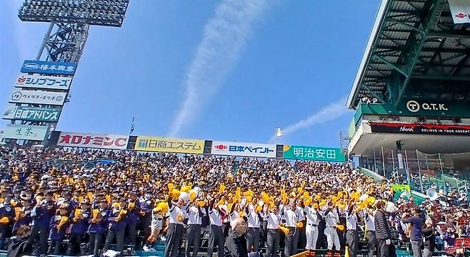 | ▲ 2026년 봄 고시엔 2차전에서 1루쪽 응원석의 테이쿄 고등학교 응원단이 열띤 응원전을 펼치고 있다. |