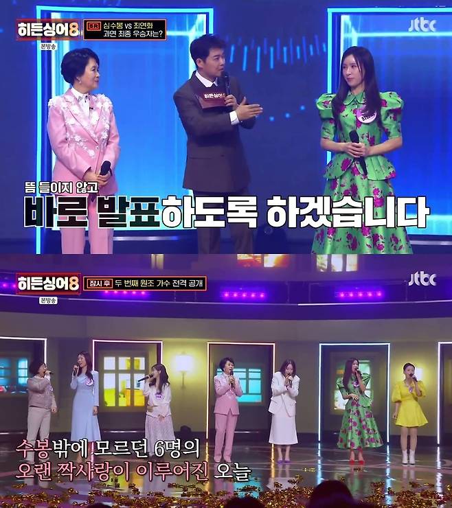 총 6개의 칸막이 속 참가자들의 열창이 이어지자 연예인 패널과 방청객들은 가짜 가수 찾기에 몰두했다. 그런데 이전 시즌과 달리 6명 전원이 모창 가수였다는 사실이 밝혀지면서 현장은 잠시 혼란에 빠지기도 했다. 이러한 진행 방식의 작은 변화 덕분에 <히든싱어8>은 1라운드부터 무대 자체에 더욱 집중하게 만드는 효과를 만들어냈다.