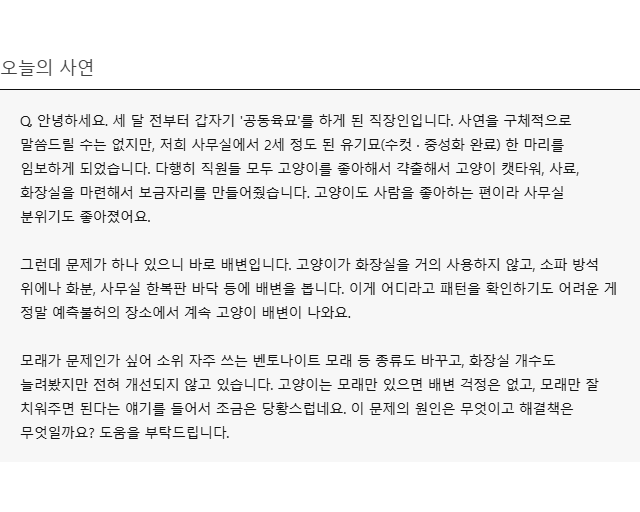 작은 환경의 변화가 때론 고양이에게 큰 차이를 만들 수 있습니다. 사무실이라는 공간에서도 고양이가 안정적으로 생활하며 배변 문제없이 직원들과 편안하게 지낼 수 있기를 바랍니다.