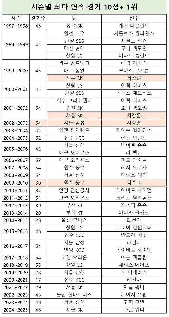 서장훈은 1999~2000시즌(45경기)과 2021~2022시즌(54경기), 2002~2003시즌(54경기)에서 전 경기 두 자리 득점을 올리며 1위를 기록한 바 있다. 1997~1998시즌부터 2000~2001시즌까지는 팀당 45경기씩 치렀다.