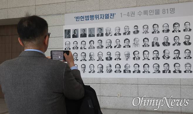 | ▲ 31일 오전 서울 용산구 백범김구기념관에서 열린 <반헌법행위자열전> 출간 기자회견에서 한 참가자가 열전에 수록된 반헌법행위자 인물을 그린 펜화를 촬영하고 있다. |