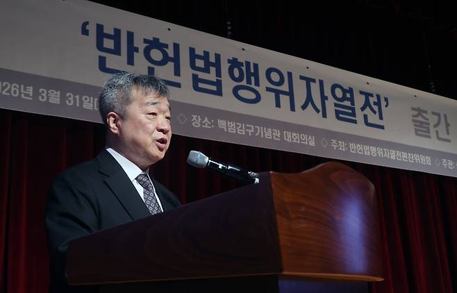 | ▲ 반헌법행위자열전편찬위원회 책임편집인 한홍구 성공회대 석좌교수가 31일 오전 서울 용산구 백범김구기념관에서 열린 <반헌법행위자열전> 출간 기자회견에서 출간 경과 보고를 하고 있다. |