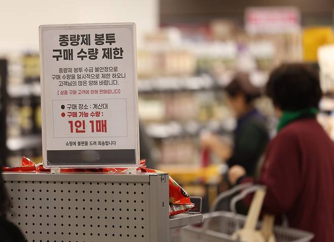 | ▲ 중동 전쟁 장기화로 나프타 수급이 불안해지며 원료 수급 위기가 산업 전반으로 확산한 가운데 지난 3월 27일 서울 시내 한 대형마트에 종량제 봉투 구매 수량 제한 안내문이 붙어 있다. |