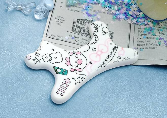 이 머치반은 괄사 형태에서 영감받은 디자인 오브제를 비롯해 파우치, 미니 CD, 가사지, 포토 카드 등으로 구성됐다. 괄사는 뷰티 업계에서 가장 핫한 아이템 중 하나로 꼽히는 마사지 도구다. 아일릿은 단순히 괄사의 기능적 형태만을 그대로 따르기보다, 팀 특유의 키치하고 사랑스러운 감성을 고스란히 녹여냈다.