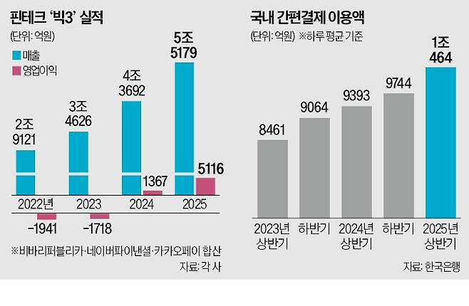 비바리퍼블리카와 네이버파이낸셜, 카카오페이 등 국내 대형 핀테크 3사의 지난해 합산 영업이익이 5000억원을 넘어섰다. 국내 최대 지방은행인 부산은행과 비슷한 규모다. 간편결제 시장이 급성장한 가운데 새로운 핀테크 사업이 순항한 결과다. 3000만명 이상이 쓰는 금융 플랫폼 기반의 탄탄한 수익 구조가 본격적인 성장세를 타기 시작했다는 평가다.