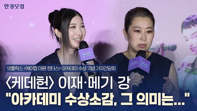 감독 메기 강과 가수 이재가 1일 오후 서울 한강로 CGV용산아이파크몰점에서 열린 넷플릭스 '케이팝 데몬 헌터스' 아카데미 수상 기념 기자간담회에 참석해 질문에 답하고 있다.
