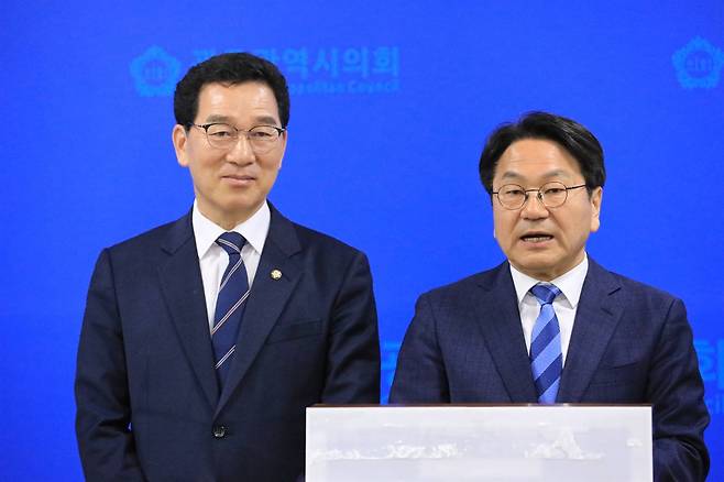| ▲ 강기정 광주광역시장이 1일 광주시의회 브리핑룸에서 군공항 이전 관련 발언하고 있다. 왼쪽은 강 시장과의 단일화 경쟁에서 승리한 신정훈 경선 후보. |