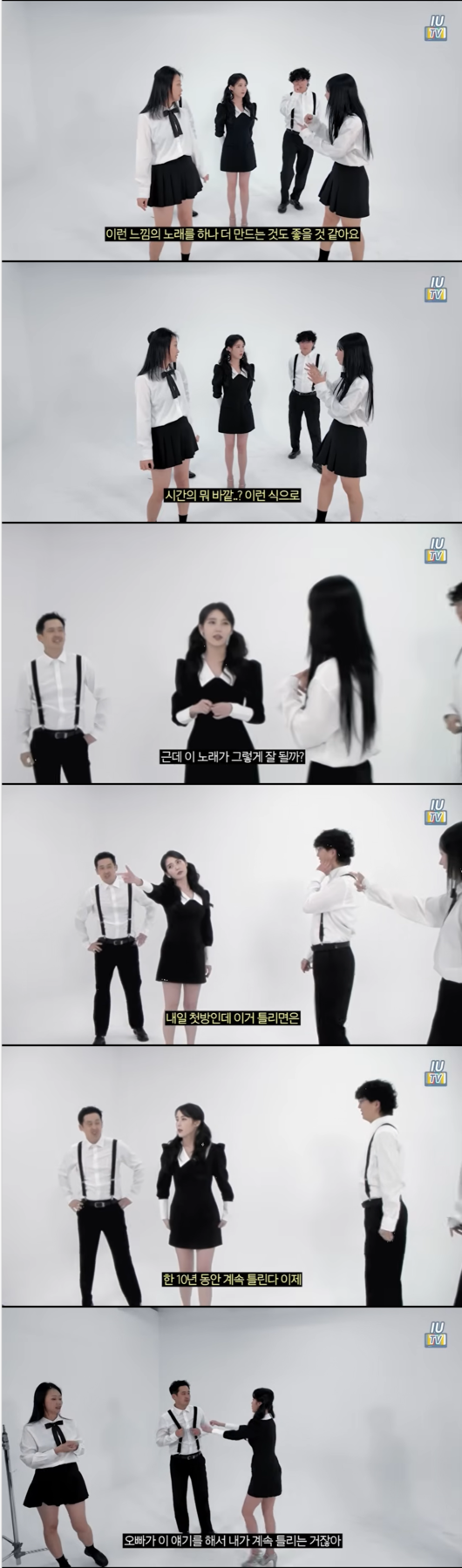 이어 다른 안무가가 "내일 첫 방송에서 틀리면 10년 동안 계속 틀리는 징크스가 생긴다"고 주의를 주자, 아이유는 "오빠가 그 말을 해서 틀리는 것"이라며 장난스럽게 안무가의 멜빵을 잡아끄는 등 친근한 분위기를 연출했다.