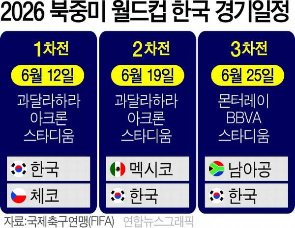 북중미 월드컵 대진표가 확정되면서 한국 대표팀의 시계도 빨라졌다. 한국은 6월 12일 체코와 조별리그 첫 경기를 치른 뒤 19일 과달라하라 아크론스타디움에서 멕시코와 맞붙는다. 이어 25일 몬터레이 BBVA 스타디움에서 남아프리카공화국과 예선 마지막 경기를 치른다.