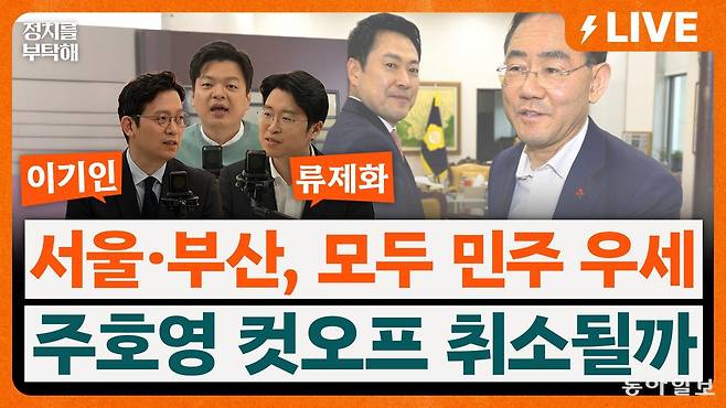 ▷조동주: 그래요. 그래도 이렇게 또 두 분 패널 조합으로 이제 저희가 앞으로 쭉 이제 인사를 드릴 것 같은데. 이제 두 분 케미 기대하도록 하겠습니다. 네 바로 들어갈게요. 오늘 전국 뒤흔든 첫 번째 씬 뭘까요? 네 서울도 부산도 모두 민주당 우세. 저희 동아일보가 이제 오늘이 창간 106주년입니다. 그래서 창간 106주년 기념으로 이 지방선거 여론조사를 실시를 해서 오늘 보도를 했는데 이제 저희가 이제 서울과 부산. 이 두 지역에 대해서 좀 심층적으로 해봤어요. 그런데 이제 그래서 서울과 부산에서 국민의힘에 지금 나온 주자들을 양자 대결로 각각 다 붙였을 때 조합을 해서 여론조사를 쭉 했습니다. 역시나 예상했던 대로 서울시장도 부산시장도 전부 다 민주당 후보가 앞서는 걸로 나왔습니다. 여론조사 결과 지금부터 하나씩 짚어볼게요. 먼저 부산으로 가보면 전재수 의원이 39.9%. 민주당 당내 경선을 했을 때 얘기입니다. 당내 경선을 하면 전재수, 이재성 이렇게 2명이 지금 경선을 할 예정인데 둘이 붙으면 전재수 39.9% 이재성 4.6%. 전재수 의원이 아무래도 인지도가 훨씬 높다 보니까 압도적으로 앞서는 모습이고. 국민의힘이 이제 박형준 현 시장과 주진우 의원 둘이 이제 경선을 치를 텐데. 그럴 경우 박형준 23.1%, 주진우 16.6%. 이렇게 결과가 나왔습니다. 그러면 이렇게 지금 나온 후보들끼리 둘 중에 하나가 돼서 양당 후보로 맞붙을 텐데. 사실 이런 경우에 약간 지금 수치로만 보면 어느 정도 예상이 되는데. 민주당과 국민의힘은 부산에서 각각 누가 올라올 거라고 보세요? 우리 이 총장님부터.