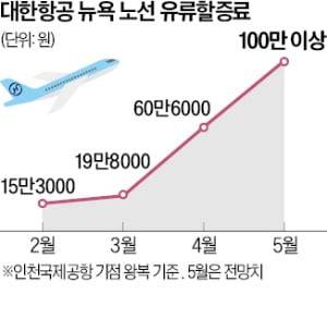 1일 대한항공 홈페이지에서 오는 24~29일 인천국제공항과 미국 뉴욕 존F케네디국제공항을 왕복하는 최저가 항공권은 124만4300원에 판매되고 있다. 이 중 유류할증료는 60만6000원으로 운임(50만원)을 뛰어넘는다. 이날부터 장거리 기준 유류할증료가 왕복 19만8000원에서 세 배 이상으로 인상돼서다. 대한항공뿐 아니라 국내 모든 항공사도 사정은 비슷하다.